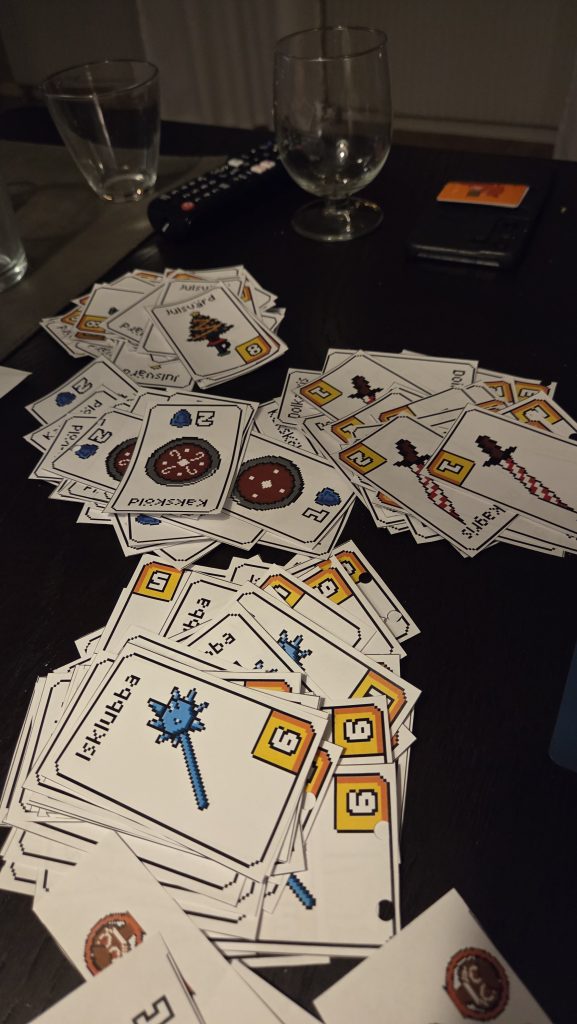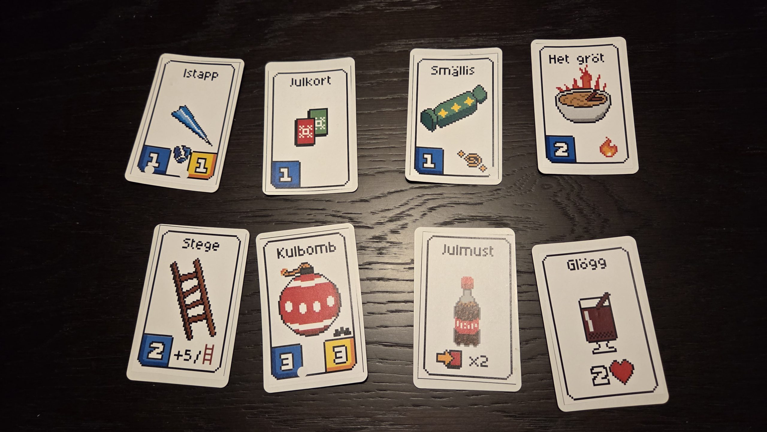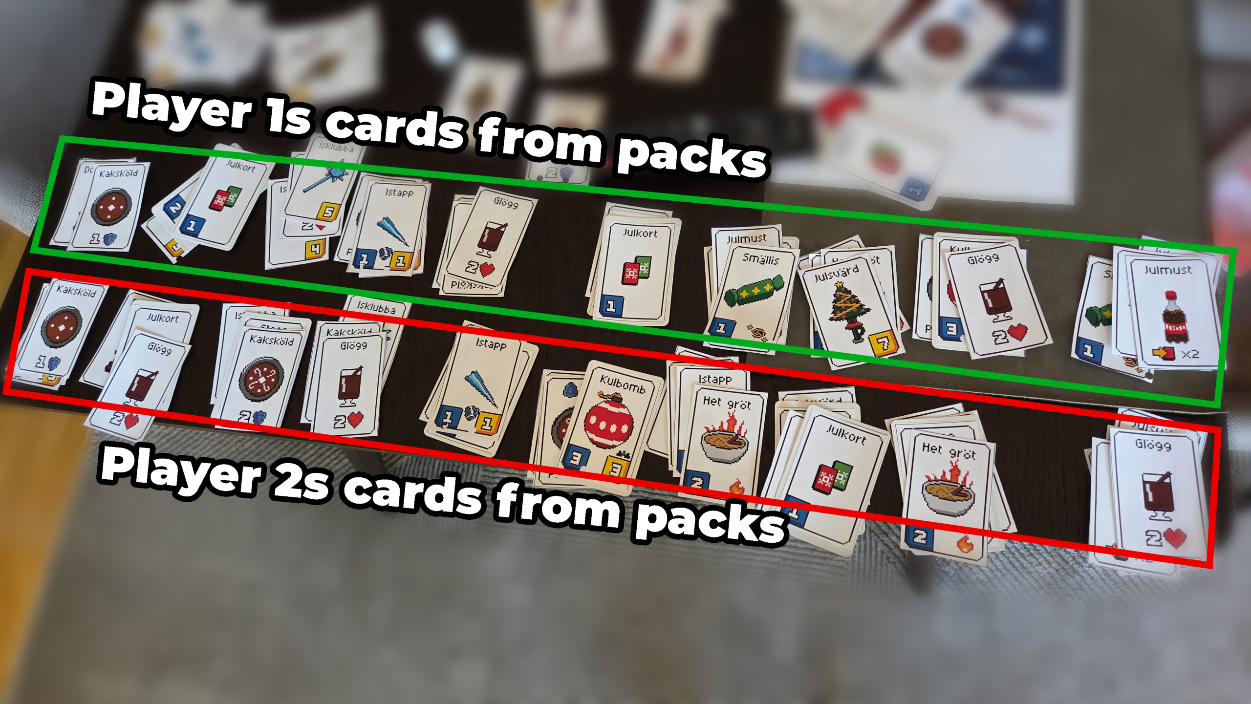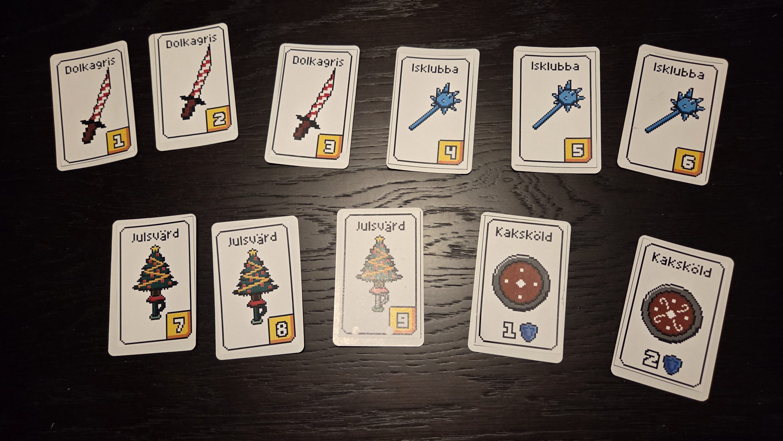 The booster packs of cards that were handed to the players were carefully altered so that each player would get the feeling of getting the stronger cards on several power spike gates. But I never introduced one new tier of attack card to only one player. So when both “Isklubba” and “Julsvärd” was introduced, both of them got at least one version of them.