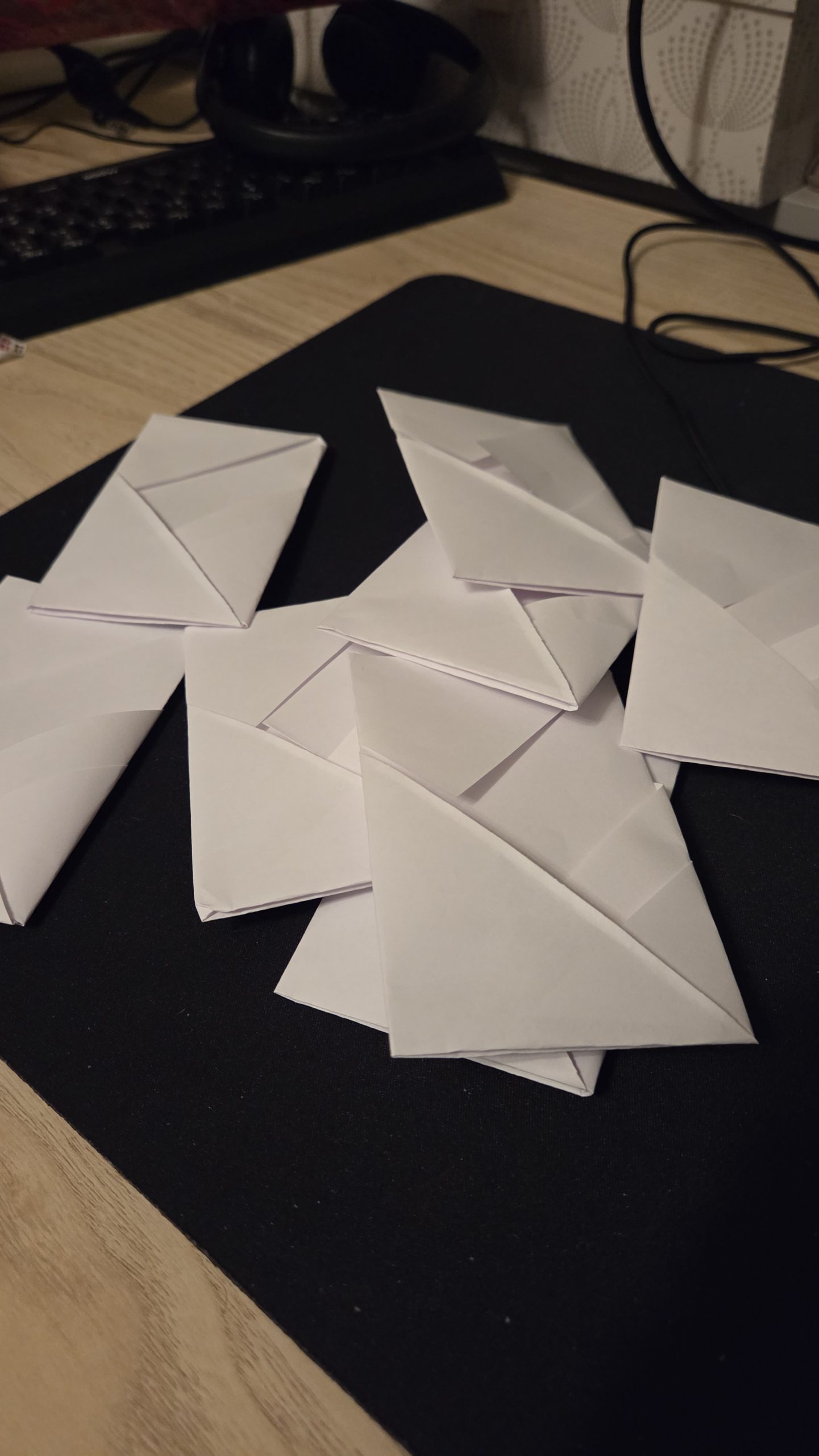 The packs were made out of 1/2 of an A4 paper where I found a video about making a glue and tapeless “envelope” which I could rapidly make in just a couple of minutes .