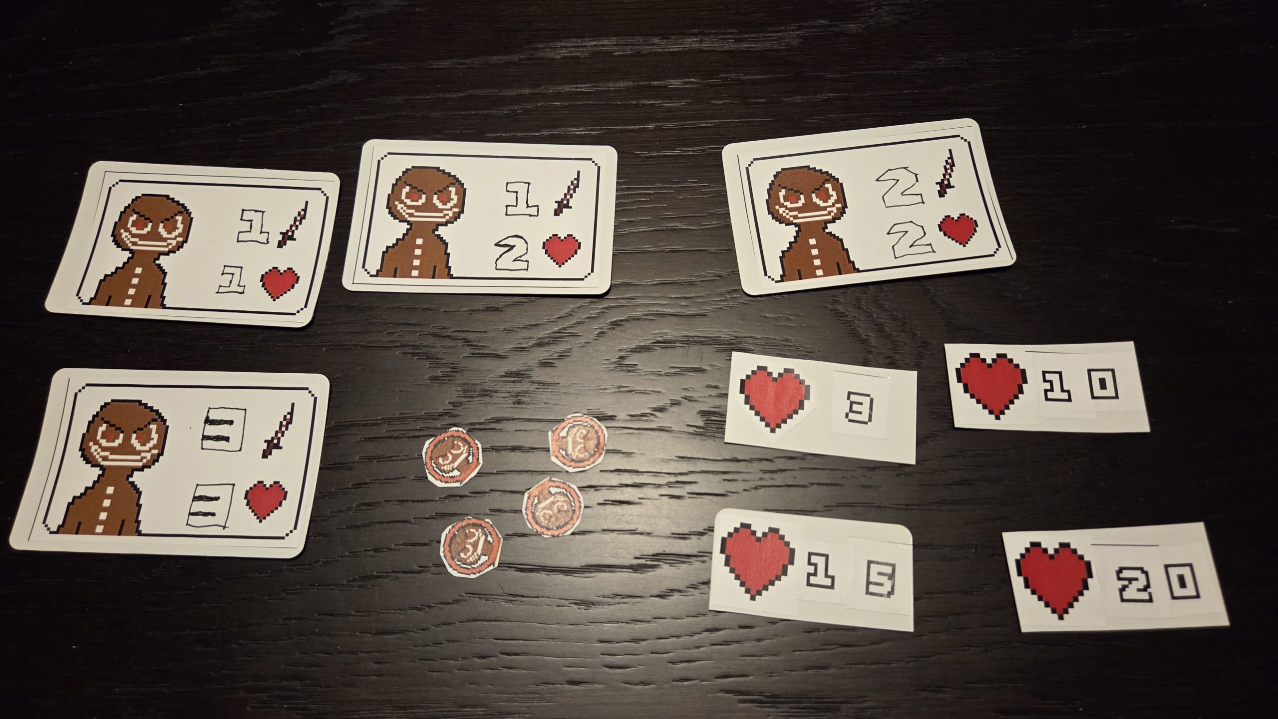 Each player starts with 10 health and their own starter deck of card. Both decks has the same starting cards in them. Health are depicted by using the same amount of real life candy as tokens.