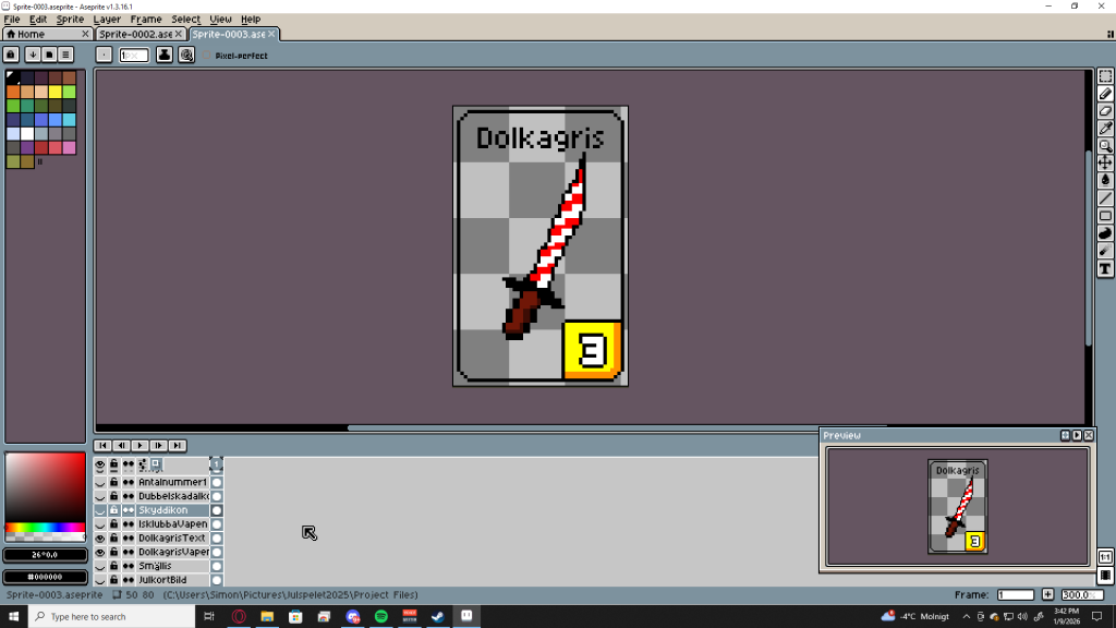 “Dolkagris”/”Dagger sugar cane” is a play on words since sugar cane in swedish is “Polkagris”, and the word for dagger is “dolk”. I attempted to do the same with the “Isklubba”/”Ice club” and “Julsvärd”/”Christmas Sword”, but couldn’t come up with something equally punny.